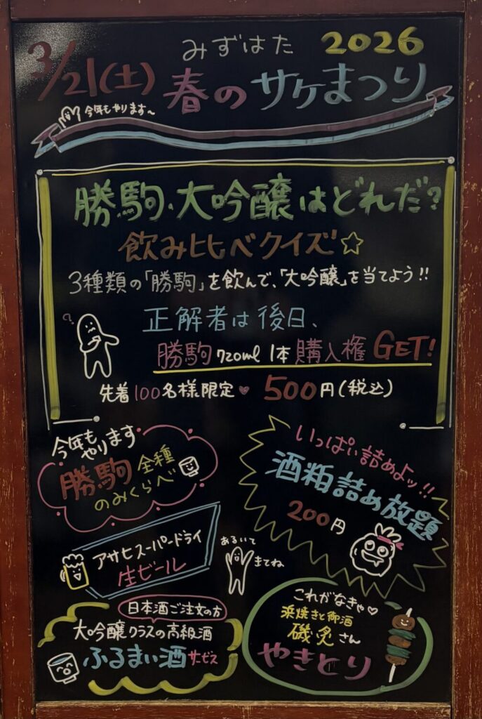 格付チェックきき酒など「みずはた春のサケまつり」 開催します!!!