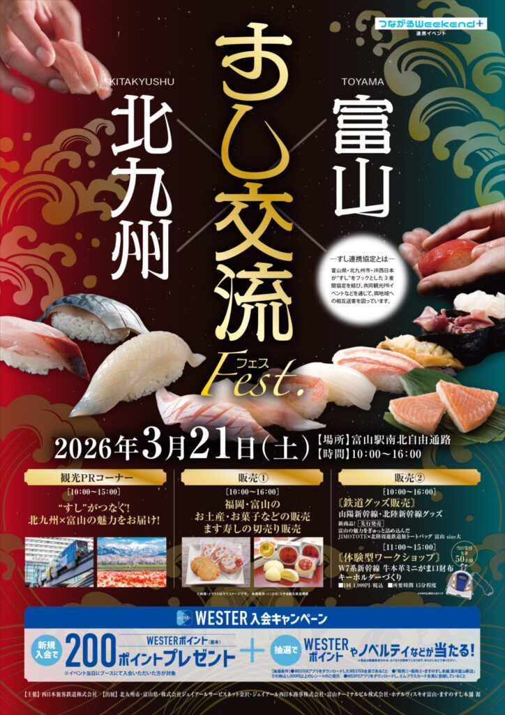 北九州×富山すし交流フェスでは、福岡県・富山県のすしをテーマとした観光PRをはじめ、お土産、お菓子、ます寿し(切売)、鉄道グッズなどの販売をおこないます!さらに、WESTERへ入会や商品購入で抽選会に参加しよう!