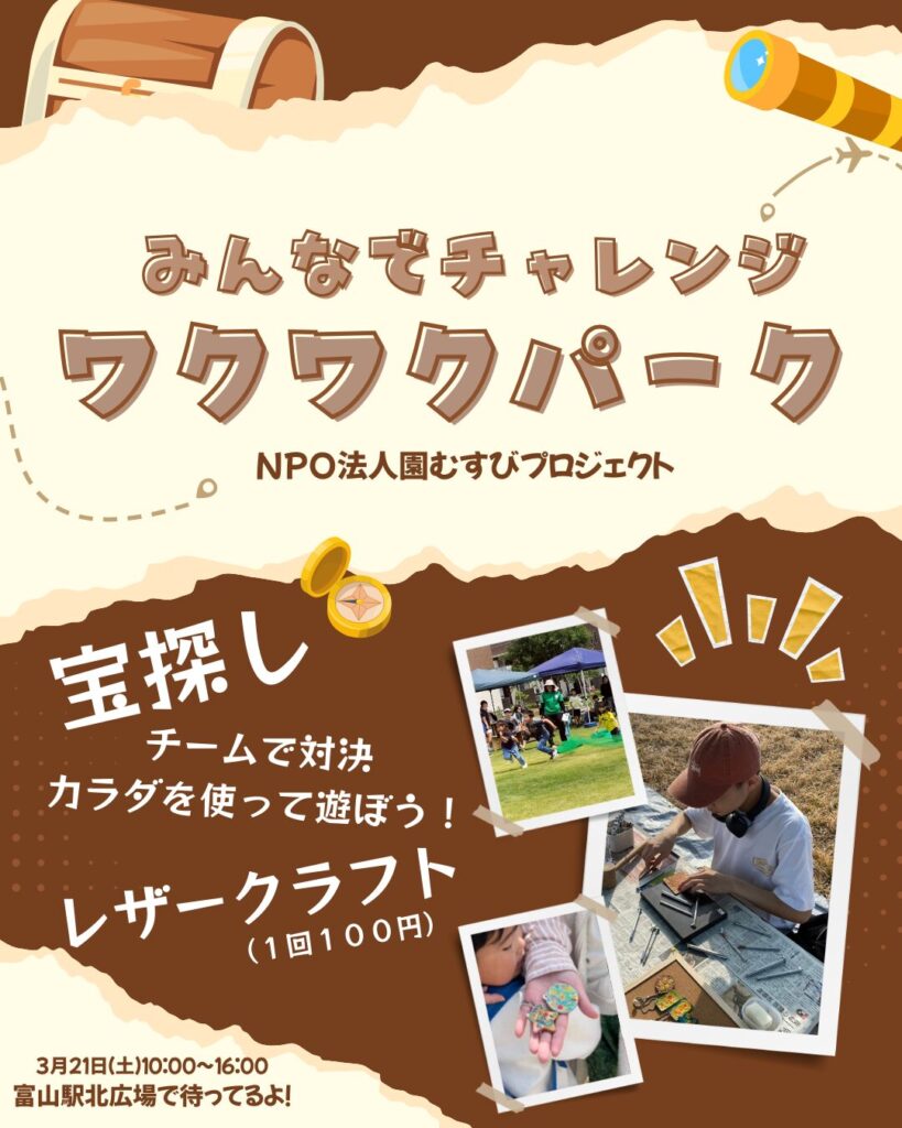 宝さがしやチーム対決遊びなどカラダを動かす遊びが盛りだくさん!親子で楽しめるワークショップ(有料)も開催!