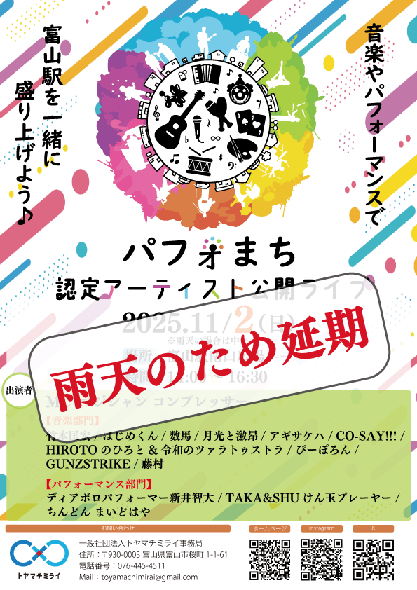 パフォまちラインセンス 『公開パフォーマンス2025』雨天のため延期となります☔