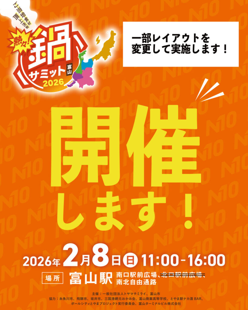 雪予報ですが、鍋サミット富山2026は一部レイアウトを変更して開催します!