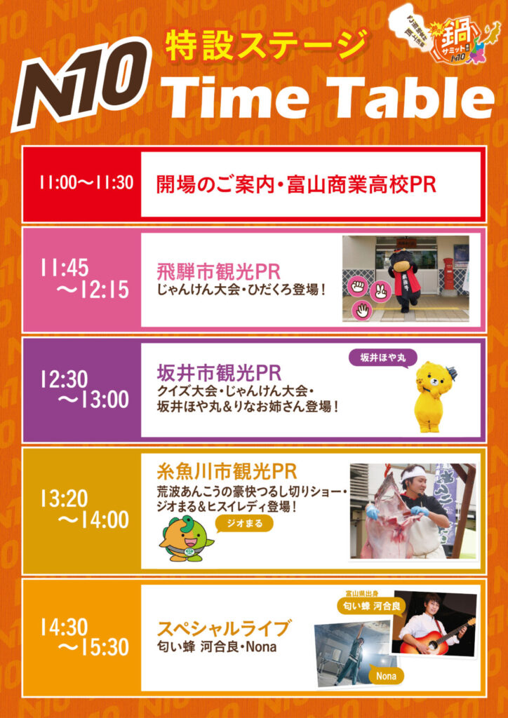 荒波あんこうの豪快つるし切りショーの他、各地域の観光PRでゆるキャラ(飛騨市:ひだくろ、糸魚川市:ジオまる、坂井市:坂井ほや丸)が登場❤また富山県出身アーティストによるスペシャルライブもございますので、飲んで・食べて・楽しみましょう!