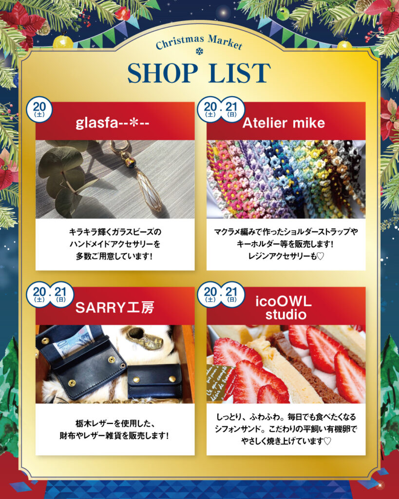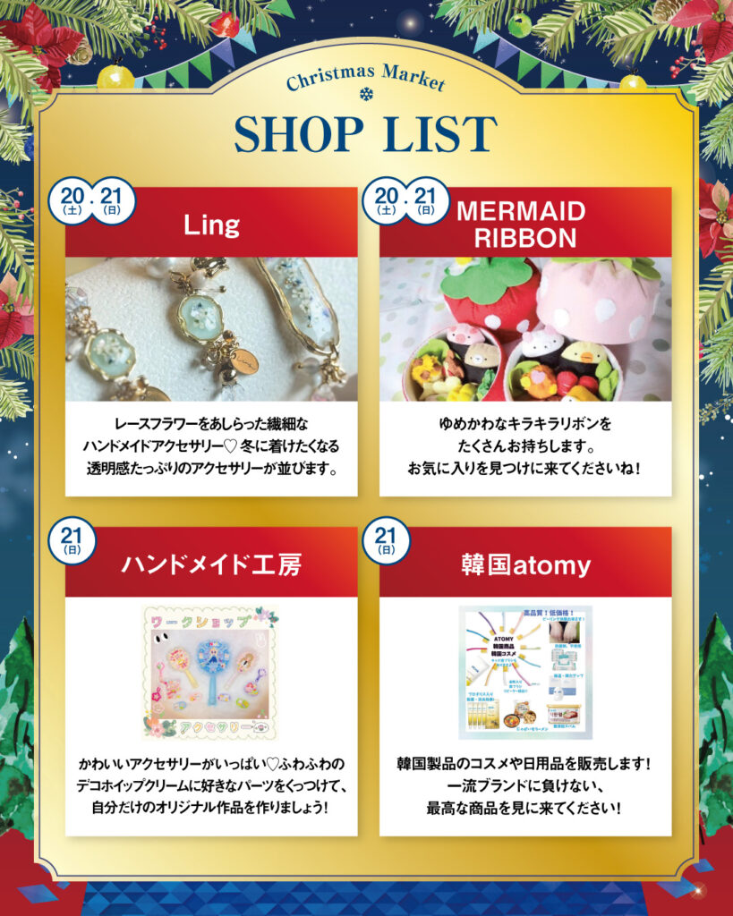 クリスマスグッズやお菓子を販売するマーケットが登場😋❤その他、巨大クリスマスリースの『フォトスポット』が登場!みんなで記念撮影をして楽しんじゃおう✨参加無料の『クリスマスオーナメントワークショップ』も開催!